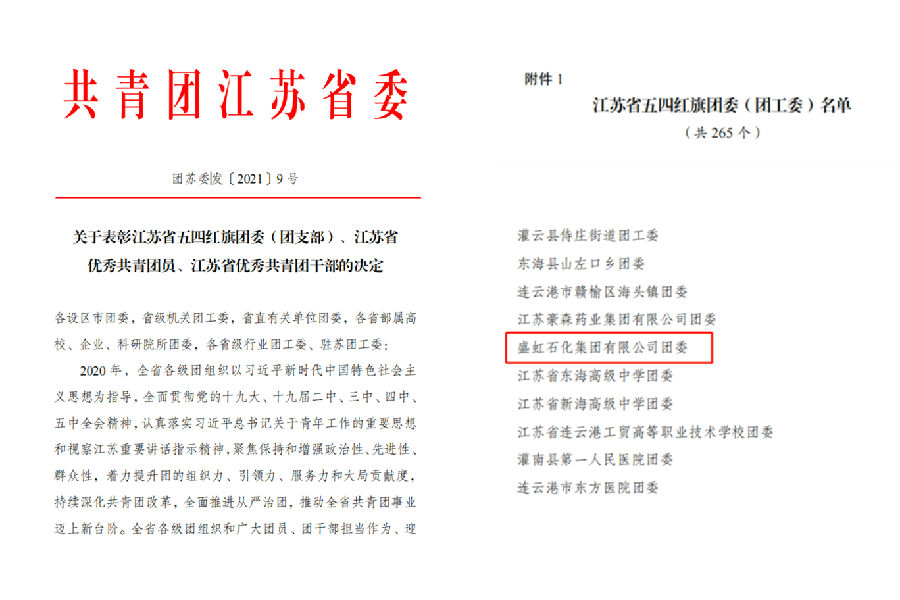 近日,共青團江蘇省委印發(fā)2021年度《關(guān)于表彰江蘇省五四紅旗團委(團支部)、江蘇省優(yōu)秀共青團員、江蘇省優(yōu)秀共青團干部的決定》授予盛虹石化集團有限公司團委“江蘇省五四紅旗團委(團工委)”稱(chēng)號。同時(shí),江蘇虹港石化團總支書(shū)記胡朝陽(yáng)被評為“全國優(yōu)秀共青團員”、新榮泰碼頭有限公司倪志偉被評為“江蘇省優(yōu)秀共青團員”。