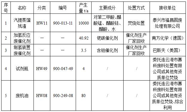 我公司的產(chǎn)生的危險固體廢物主要包括汽提蒸餾殘渣、加氫反應廢催化劑、制氫裝置廢催化劑、廢試劑瓶、廢機油,全部委托有資質(zhì)單位處置或綜合利用。